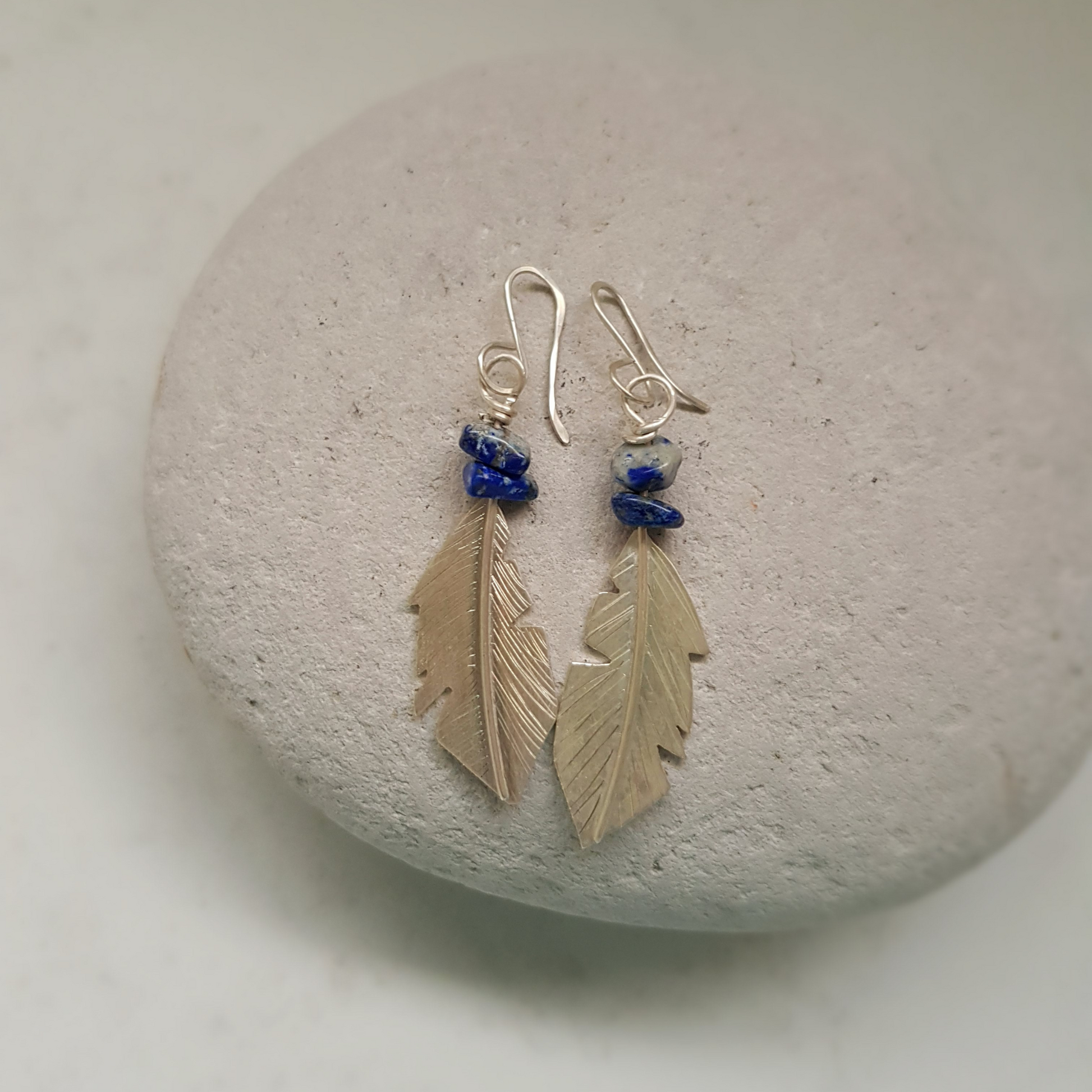 Feather earrings made with sterling silver and tiny lapis lazuli stones, a symbol of wisdom, power and truth.